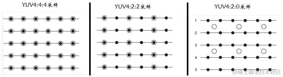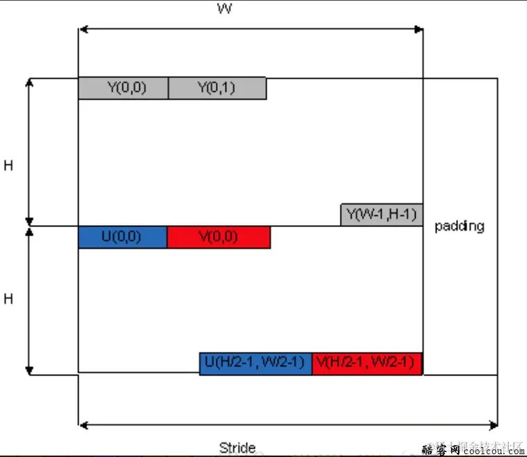 - YUV 4:2:0,每4个 Y 分量共用一对 UV 分量,每像素占用 (Y + 0.25U + 0.25V = 8 + 2 + 2 = 12bits)1.5 字节。