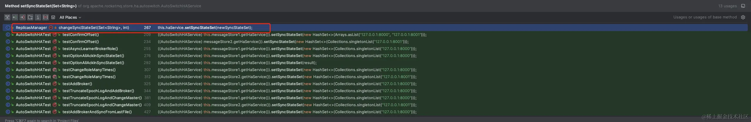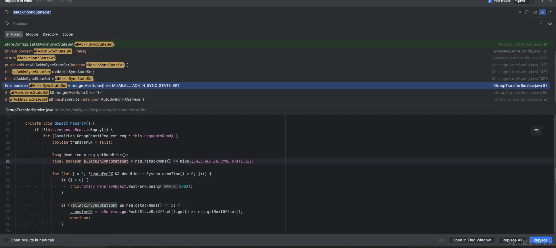 我们全局搜索allAckInSyncStateSet在何处使用关键字能直接找到org.apache.rocketmq.store.ha.GroupTransferService#doWaitTransfer中有使用