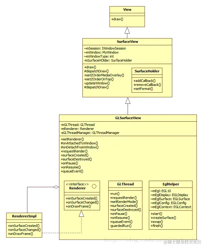 由如下类图可知,类似SurfaceView的SurfaceHolder提供了一些操作Surface的接口,GLSurfaceView中的EglHelper实现了管理EGL环境的工作,GLThread作为渲染线程。