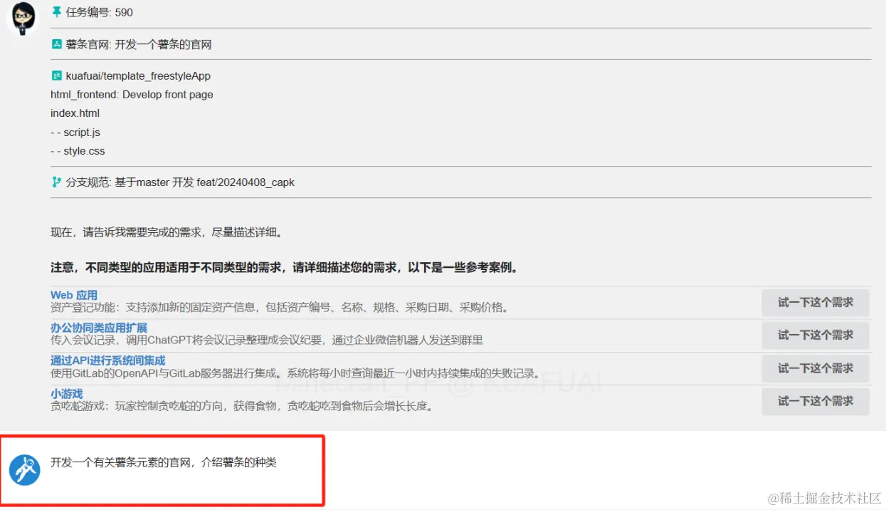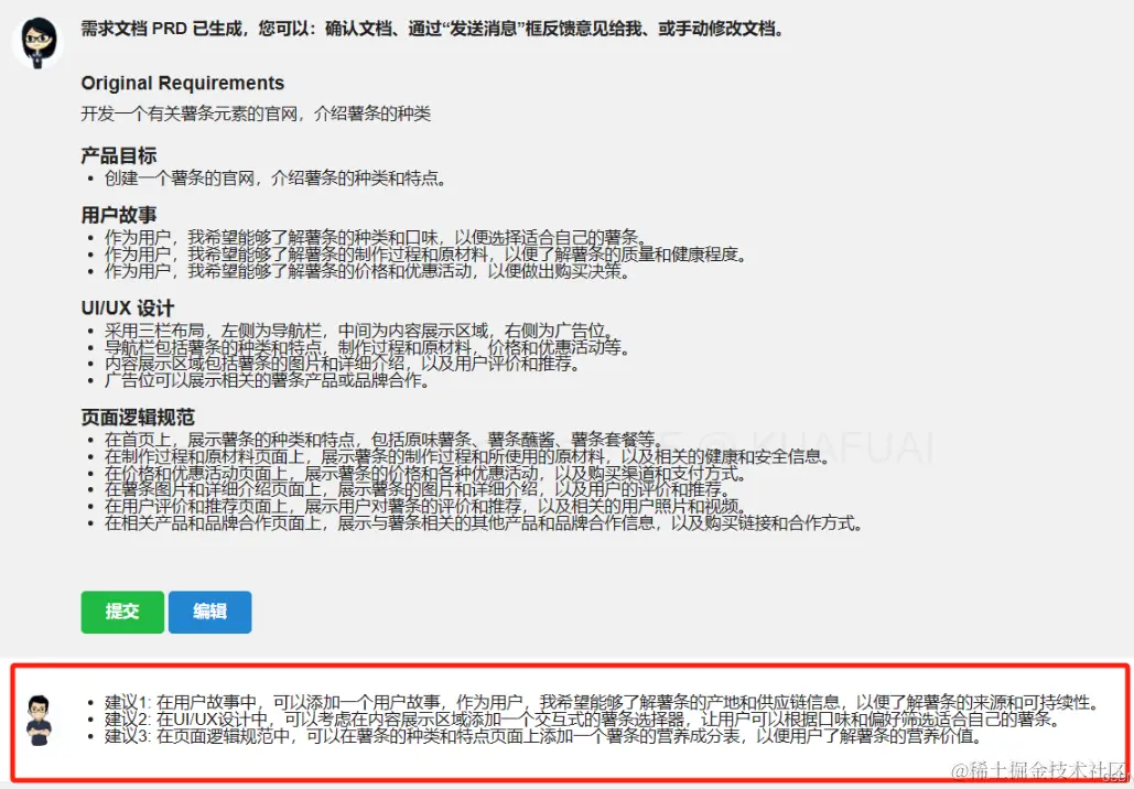 提交需求之后,AI就会开发好需求文档,红框内标出的内容,就是刚才我说的补全和完善需求的功能,我们继续提交即可