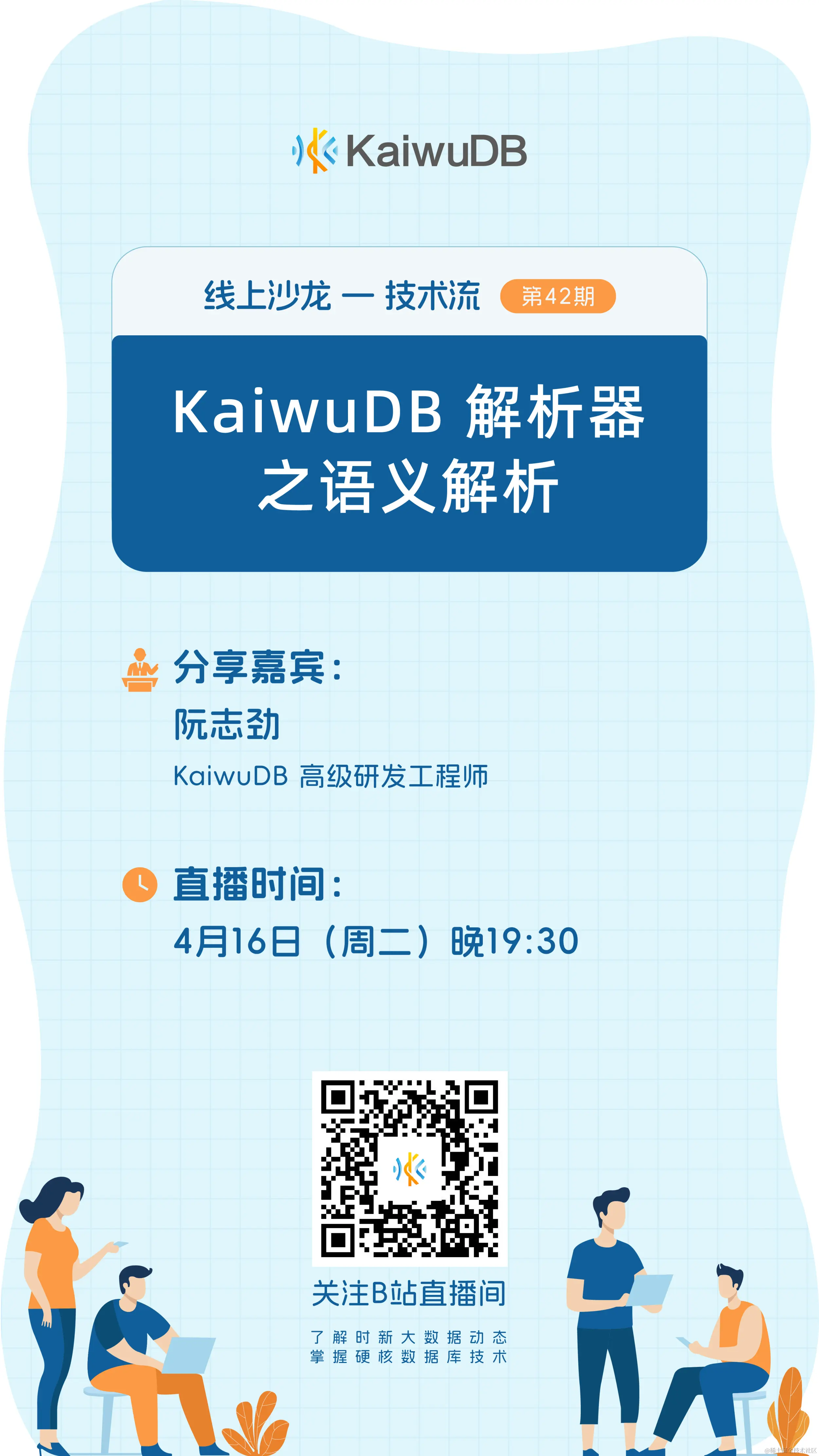 本期直播我们邀请到 KaiwuDB 高级研发工程师阮志劲为大家分享 《KaiwuDB 解析器之语义解析》 ,阮老师拥有多年数据库内核研发经验,专注于 SQL 编译与计划优化,现负责时序数据库内核功能开发与优化工作。