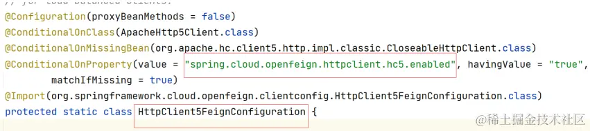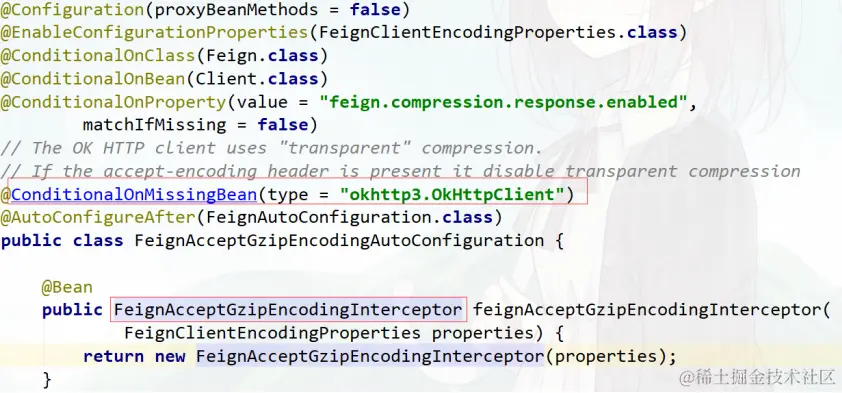 注意:当 Feign 的 HttpClient不是 okHttp的时候,压缩配置不会生效,配置源码在 FeignAcceptGzipEncodingAutoConfiguration