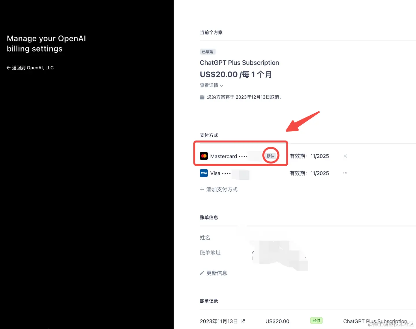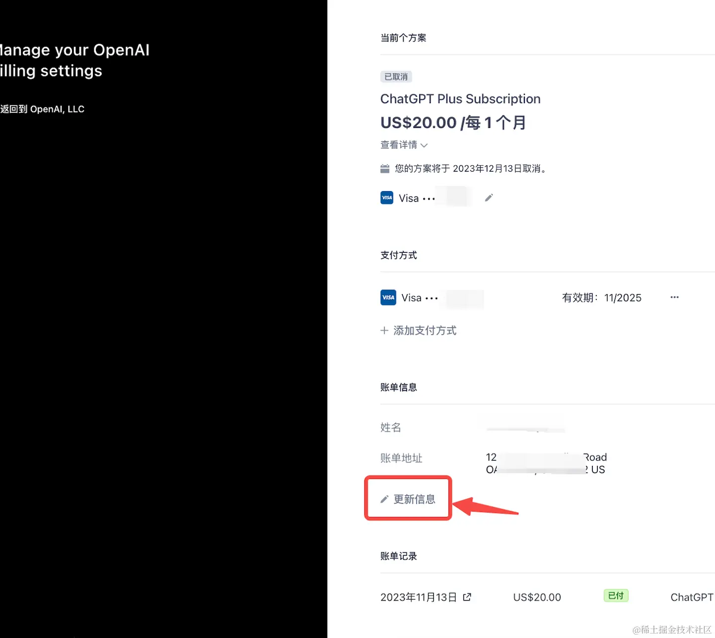 在支付管理页面,先修改账单信息,点击「更新信息」