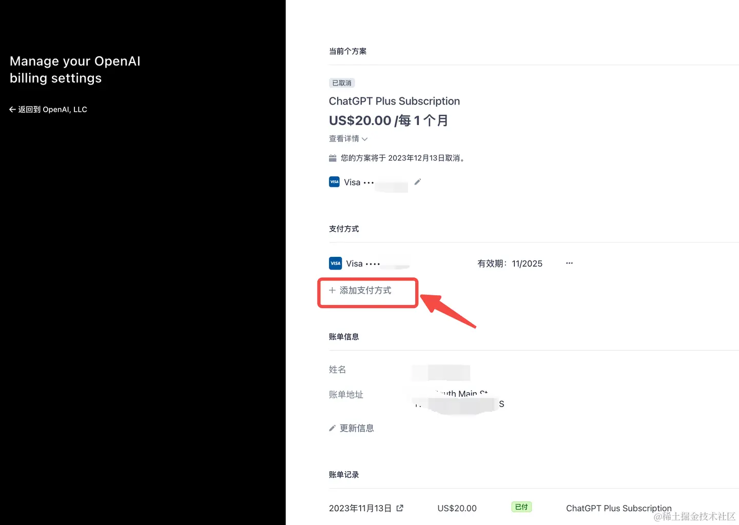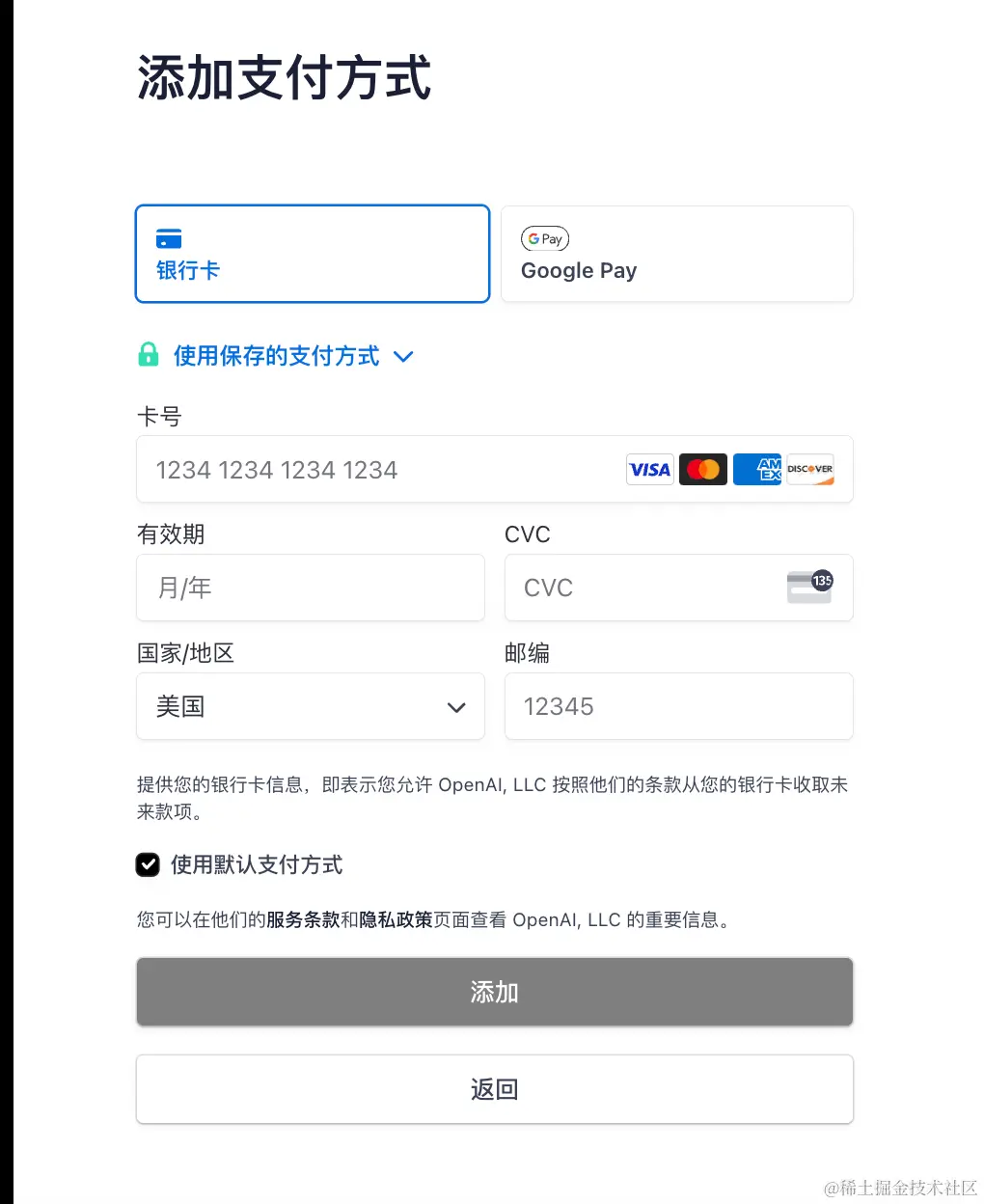 然后点击「添加支付方式」,填写卡片信息和账单地址的邮编就行了