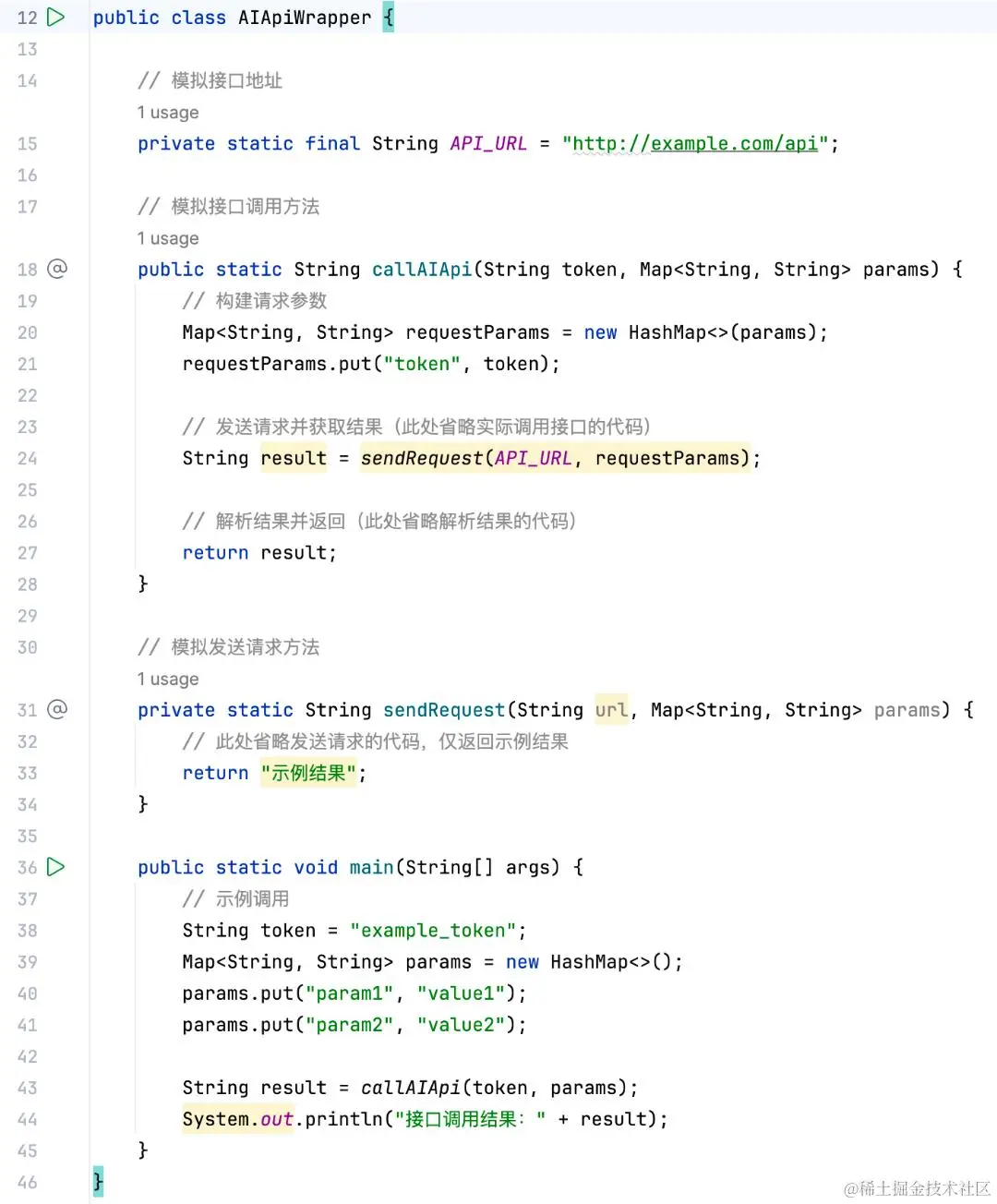 以上示例代码演示了一个简单的定制化接口封装类,其中的 callAIApi 方法用于调用AI接口。在实际应用中,我们可以根据具体的接口调用需求和业务逻辑进行优化和扩展,确保接口封装类能够满足我们的实际需求。