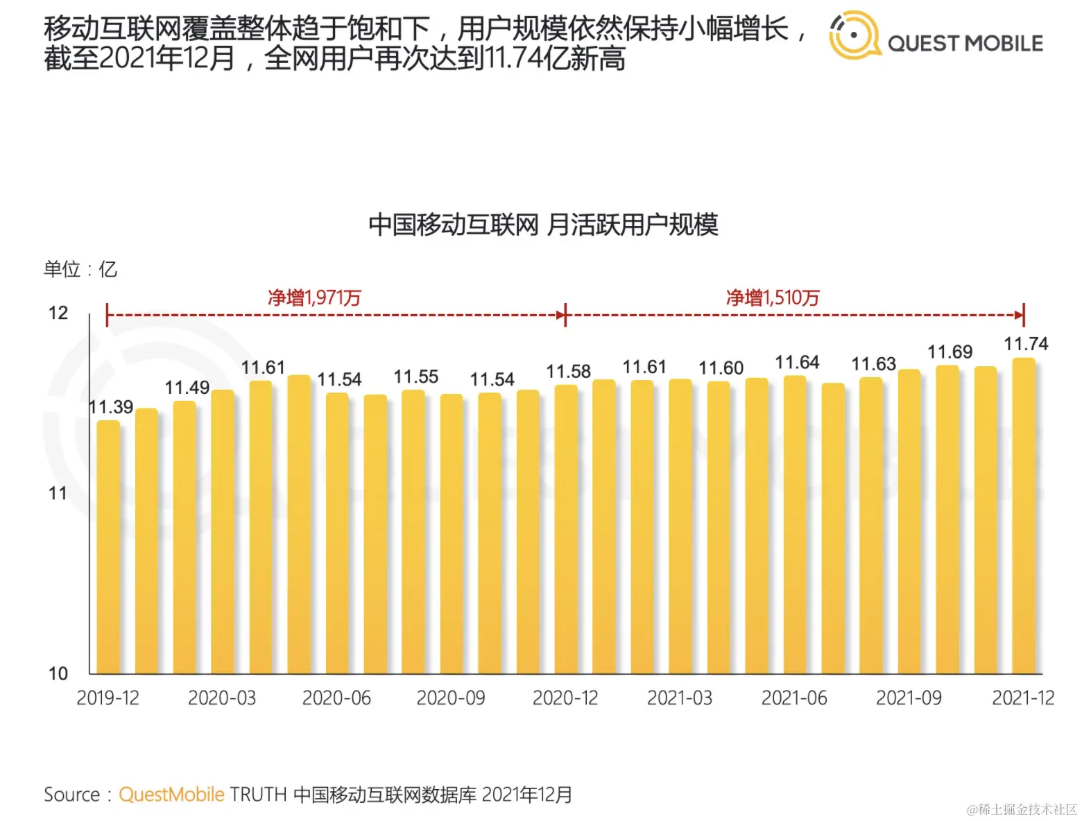 QuestMobile数据显示:截止2021年底,中国移动互联网月活跃用规模达到11.74亿人,增速逐渐呈放缓趋势,用户渗透率接近天花板。客户的增长速度越趋于平缓,品牌在不同成长阶段也要适应增长节奏的变化,越来越多主流商家不得不利用超级App的生态沉淀自己的私域流量。
