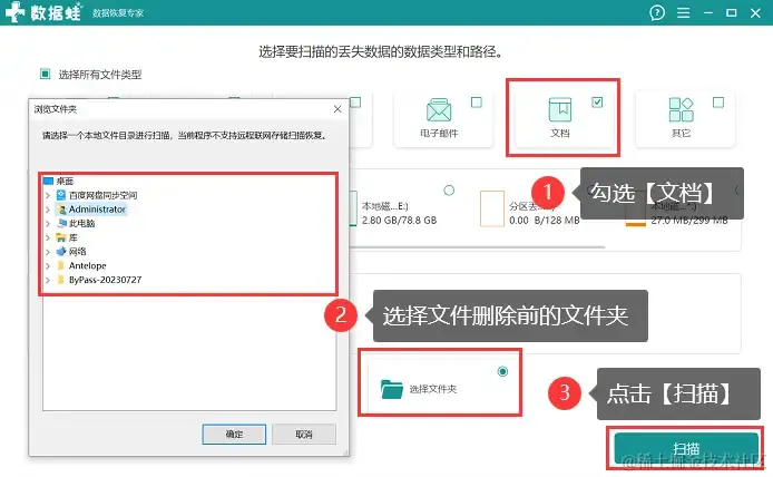 步骤2:需要恢复表格的用户可以勾选上【文档】,并选择文件删除前所在的文件夹,单击【扫描】 ;