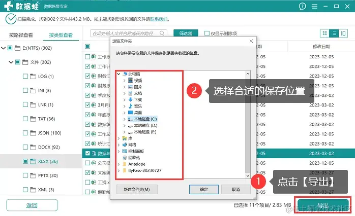 步骤4:将所有需要恢复的文件都定位到后,将它们都勾选上,点击 【导出】,并选择一个新的位置保存恢复后的文件。