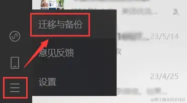 (1)在电脑打开微信并进行登录,点击**【三】形状的图标,选择【迁移与备份】**选项。