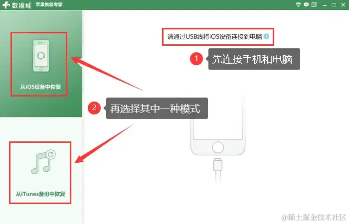 (1)打开官方软件,先通过USB线将苹果手机连接到电脑。连接成功后,根据自己的需求,选择对应的扫描模式:**【从iOS设备中恢复】适合没有备份过数据的用户;【从iTunes备份中恢复】**适合有通过iTunes软件备份手机数据的用户。