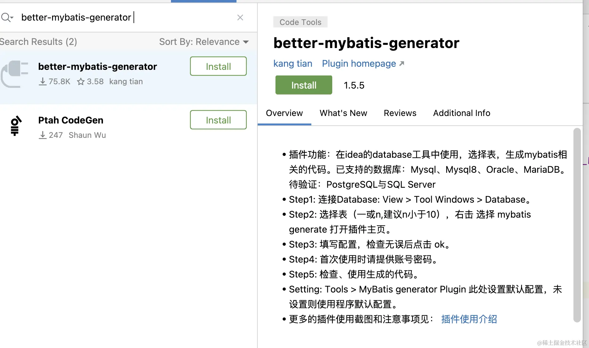 一款好用的Mybaits代码生成插件 胖胖的程序猴 2024-04-10 89 阅读1分钟 最近项目换了Mybatis框架,试了好几款代码生成插件,这里记录下一款个人觉得不错的插件。 better-mybatis-generator 这是idea插件库里面的插件 插件安装后需要在idea的datasource里面连接下需要生成代码的数据库 连接成功后对着表按右键会出现插件选项 点击进去后就可以定义生成代码的选项了