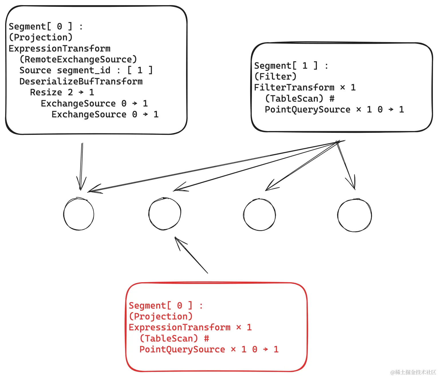 普通的query会生成执行计划,分为两个阶段:阶段一,segment 1下发到各个节点去执行,阶段二 segment 0 汇聚各个节点的数据,这种计划会带来大量的 plan 序列化反序列化,网络传输、数据汇总等一系列的开销;而在点查场景中,可能存在点查只会命中一条数据,那么这一条数据势必就会存在于某一个节点上,那么没有必要把计划发送到各个节点。为此,我们做了如下优化: