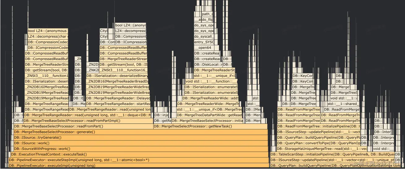 - 点查读放大严重:在下图中有很多decompress函数,对于通用的OLAP引擎,读一行数据通常也需要读取大量的block,再将block解压反序列化成内存格式,需要消耗大量的CPU资源。在高并发的场景下,点查读放大的问题更加突出。