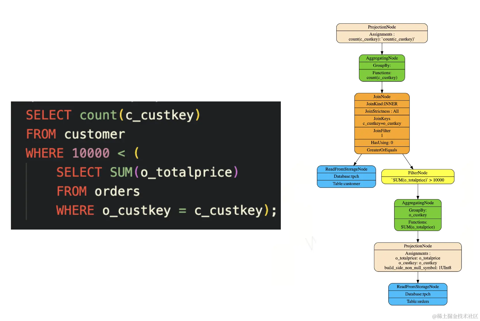 - 相对社区版ClickHouse,ByteHouse实现了完整的解关联,从而确保tpcds所有查询能够运行。如下图所示,一个customer表和一个含orders表的子查询进行关联,最后的计划会展开成对应的join、agg和filter等算子。