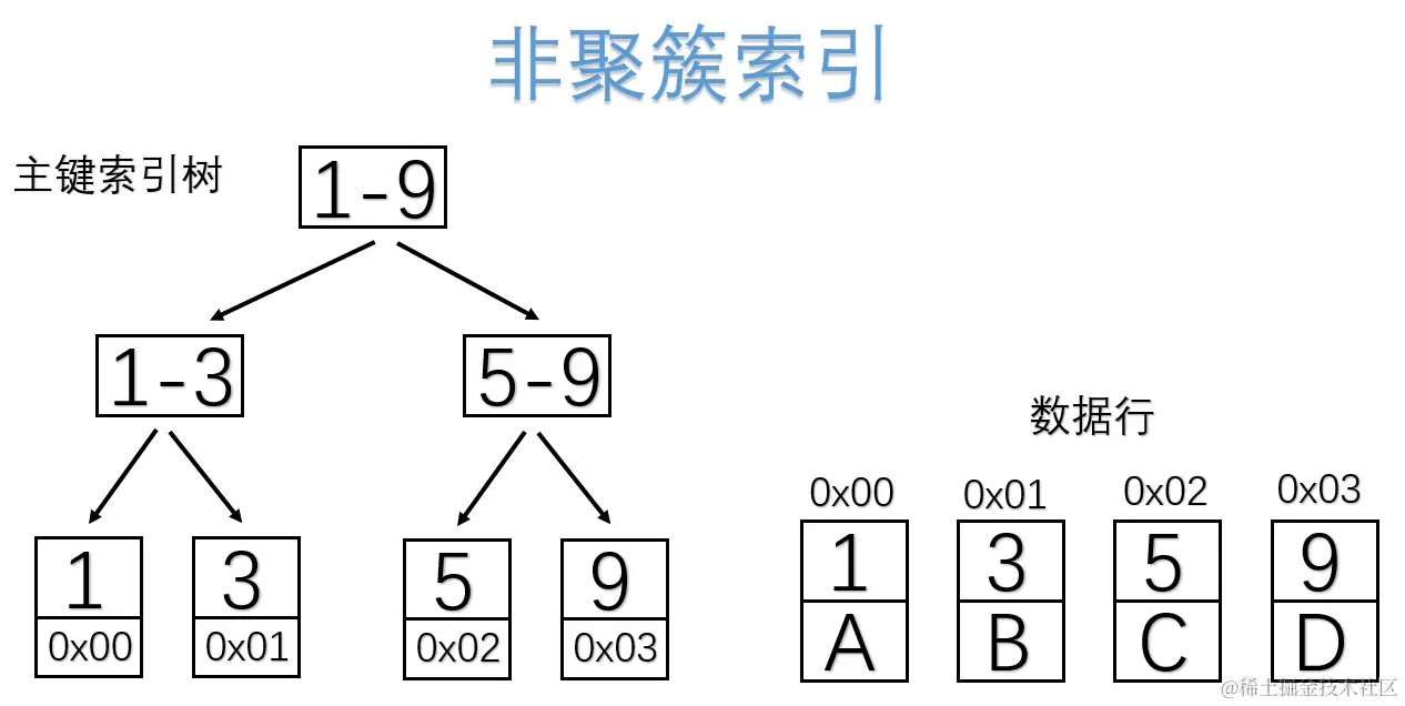 - 非聚簇索引:叶子节点只放了主键。