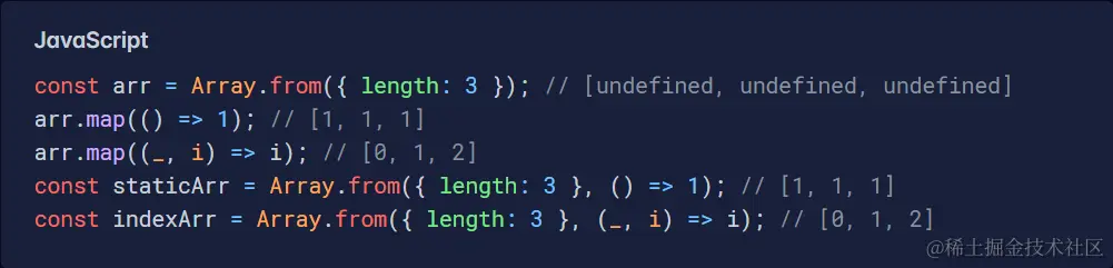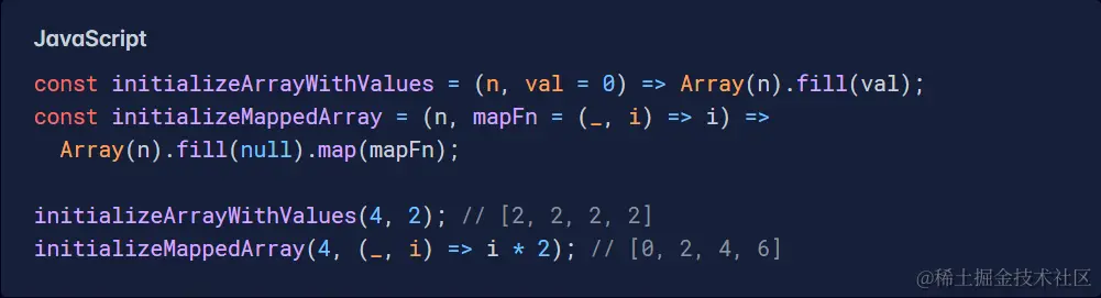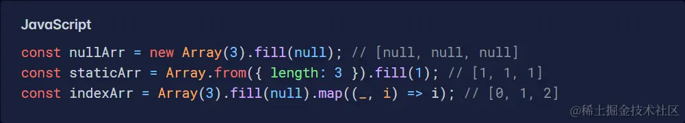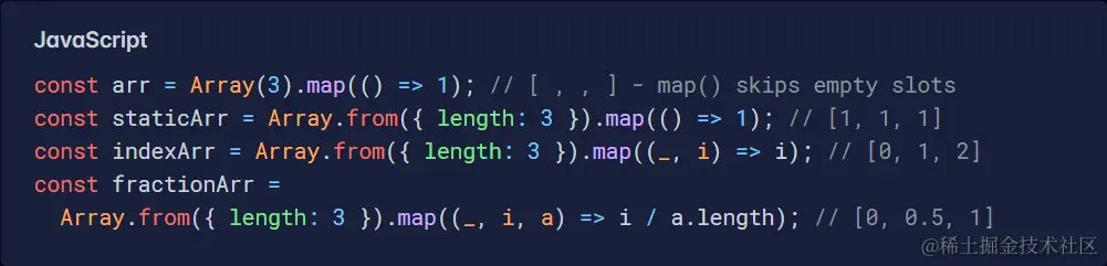 如果此类操作在您的应用程序中非常常见,则性能可能是一个问题,但总的来说,这些选项都不是特别慢。Array() 构造函数似乎是最快的。话虽这么说,如果与 Array.prototype.fill() 结合使用,它可能是用单个值初始化数组的最佳选择。奇怪的是,即使您随后链接 Array.prototype.map() 调用来创建动态值,这种性能优势仍然存在。因此,我个人的建议如下: