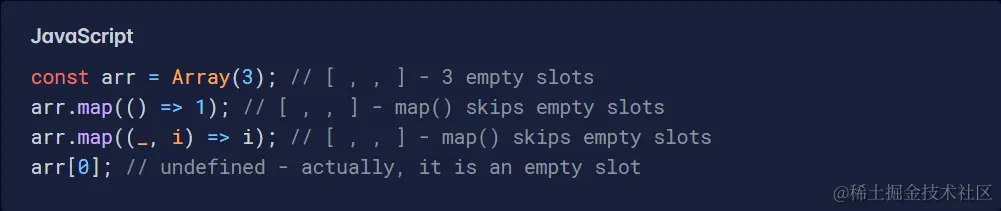 您首先要接触的可能是 Array() 构造函数。与直觉相反,这可能是单独使用时最有问题的选项。虽然它适用于任意数量的参数来创建具有给定值的数组,但它在其他地方几乎都存在不足。它的大多数问题源于填充结果数组的漏洞或“空”值以及如何在其他地方处理这些值。