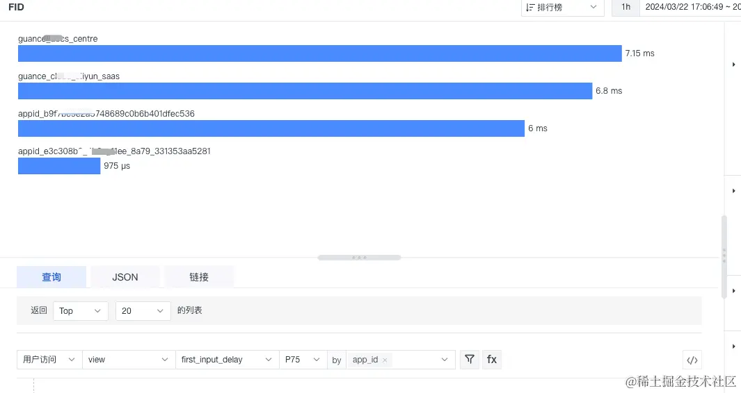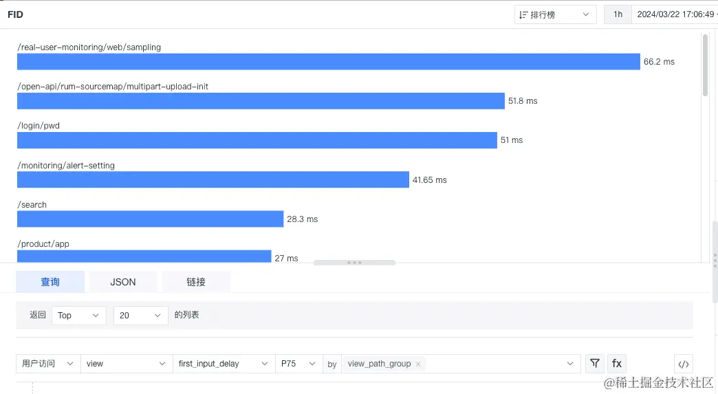 通过排行榜能够展示不同页面组 FID 的情况,根据页面组的指标表现来有针对的优化 FID :