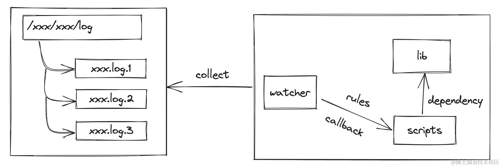 watcher 实时采集日志,通过回调 scripts 中的 Lua rules 触发业务逻辑。scripts 依赖的公共类 Lua 函数和第三方库放在 lib 中。遵循需求,最终结构如下图。