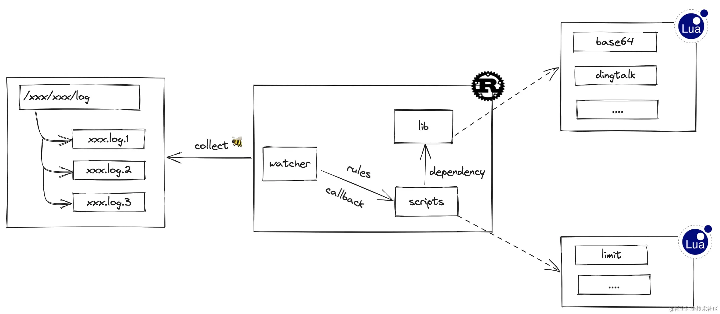 因此,笔者选择使用 Rust 来开发做 watcher 模块开发,并集成 Lua 引擎到项目中,使用 Lua 脚本来提供可扩展性。Rust 高性能和可靠性非常适合来做这种非业务型系统开发,而 Lua 引擎极小的体积与 Rust 结合后,又为其带来了动态性。