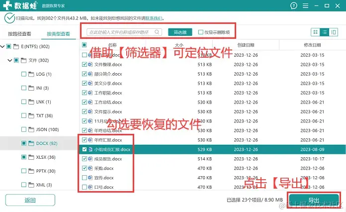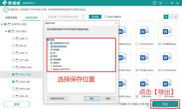 步骤4:将所有需要恢复的文件勾选完毕后,单击【导出】,选择与文件原保存位置不同的磁盘保存导出后的文件。