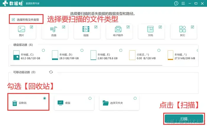 步骤2:选择界面上,根据提示,对需要恢复的文件类型进行勾选,并勾选上【回收站】 ,点击下方的 【扫描】按钮;