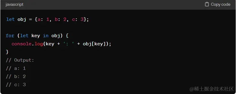 for...in 循环用于迭代对象的可枚举属性。它会遍历对象中的每个可枚举属性,包括原型链上的属性。