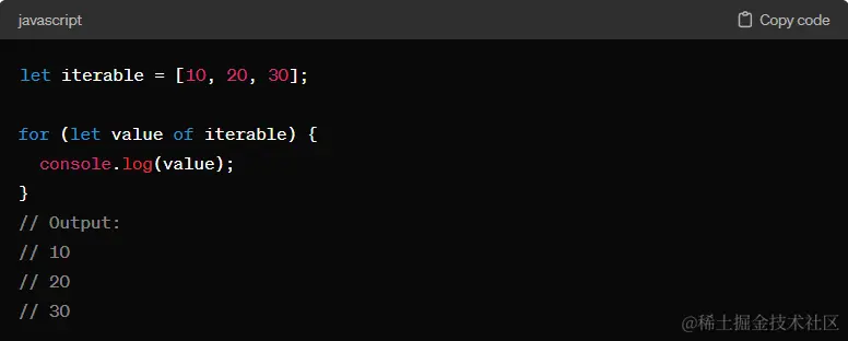 for...of 循环用于迭代可迭代对象(iterable objects),比如数组、字符串、Set、Map 等。它会遍历对象中可迭代的属性值。