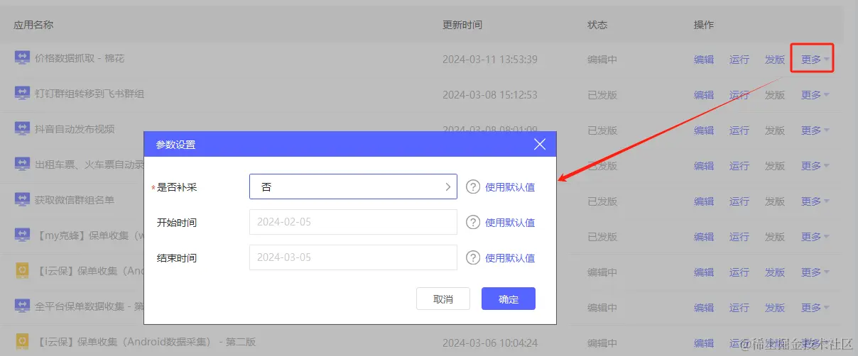 2. 需要补采时,在运行参数中“是否补采”设置为“是”,并设定补采时间段即可运行补采逻辑