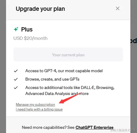 ⑥、打开GPT官网登录后选择左上角升级至plus,来到信用卡付款界面