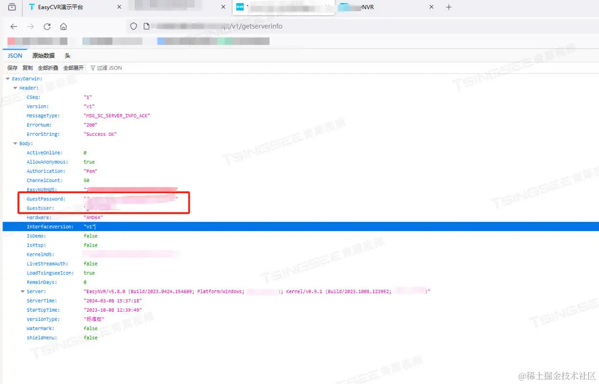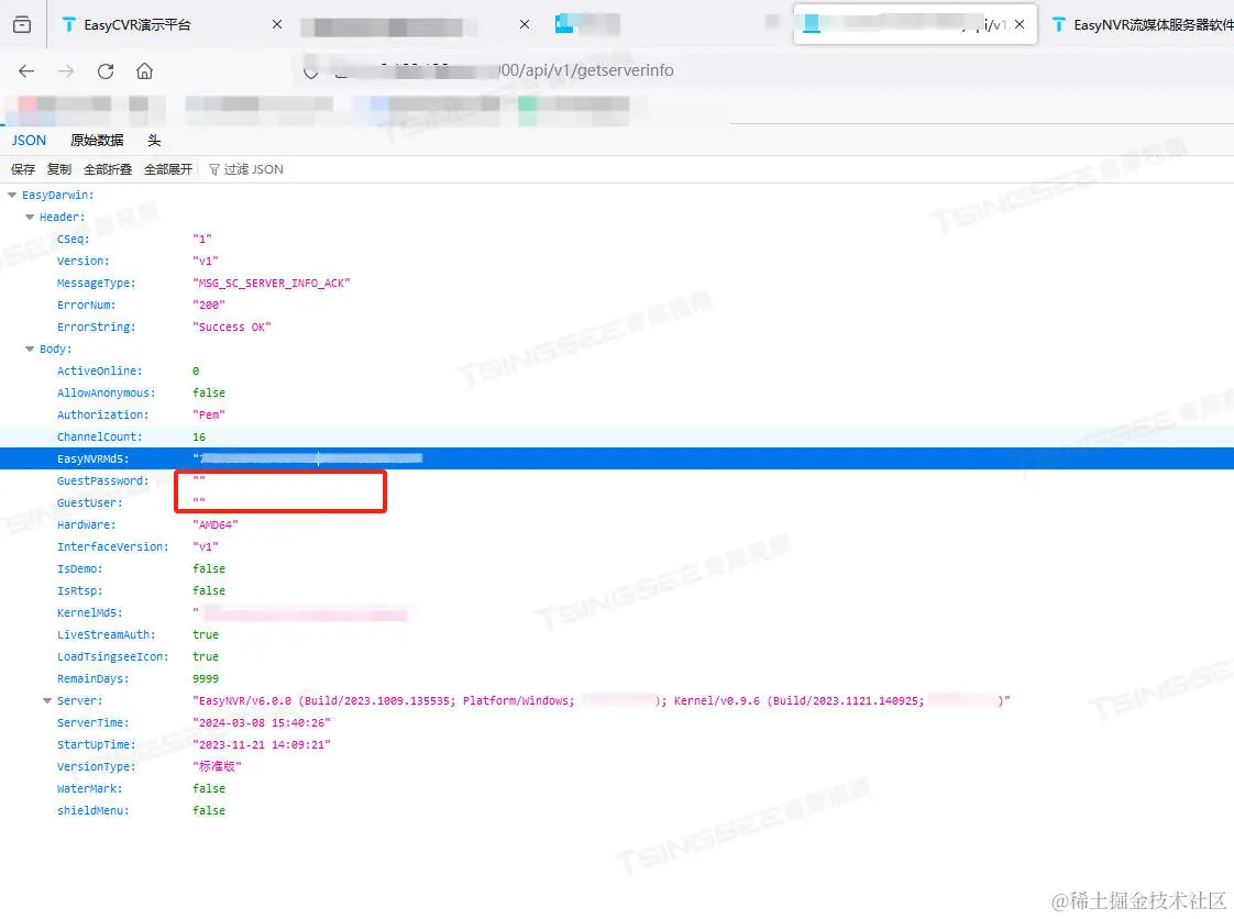 有用户反馈,通过安全扫描发现,EasyNVR开启了匿名登录,调用http://url:port/api/v1/getserverinfo接口后,会返回匿名用户的用户名和密码。