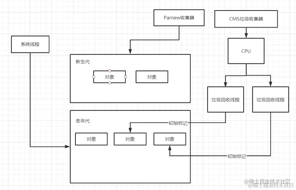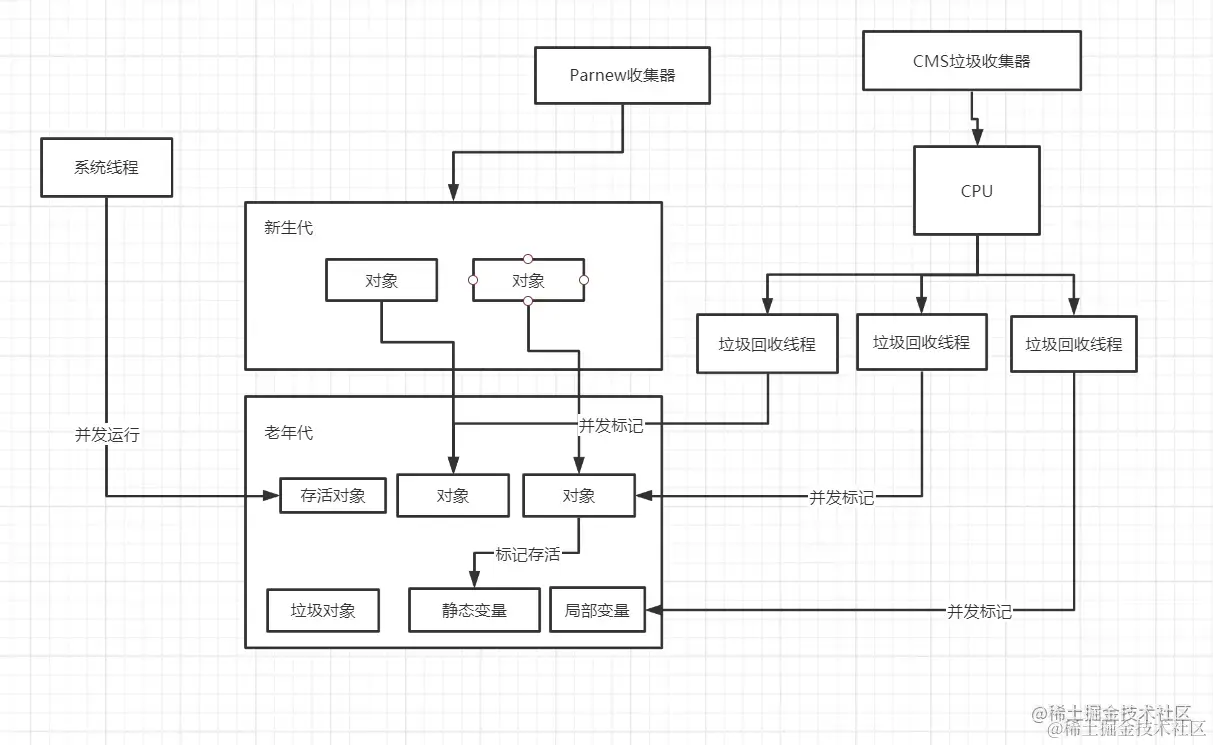 并发标记阶段:可以和用户线程一起并发执行,此时系统进程会不断往虚拟机中分配对象,而垃圾收集线程则会根据gc root对于老年代中的对象进行有效性检测,将对象标记为存活对象或者垃圾对象,这个阶段是最为耗时的,但是由于是和用户线程并发执行,影响不是很大。