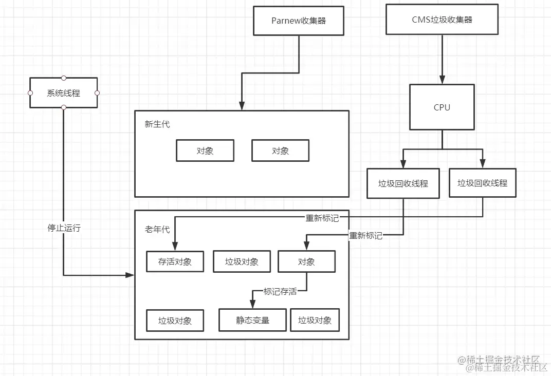 - 重新标记:需要 stop the world,这个阶段会继续完成上一个阶段的动作,对于上一个步骤标记的对象进行二次遍历,重新标记是否存活。