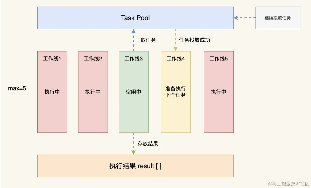 假设支持最大并发执行的任务数是5个,先创建5个执行工作线,每个工作线开始取任务并执行。当某个工作线的任务执行完毕,则再次从任务池中取任务。直到某个工作线取不到任务时,表示全部执行完毕,进行执行回调方法。