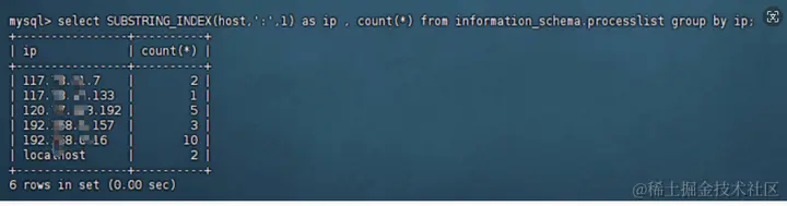 select SUBSTRING_INDEX(host,':',1) as ip , count(*) from information_schema.processlist group by ip;