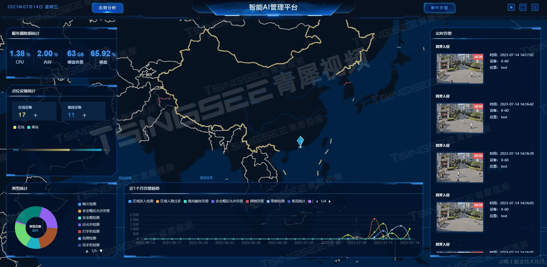 TSINGSEE青犀AI智能分析网关V4内置了近40种AI算法模型,支持对接入的视频图像进行人、车、物、行为、烟火等实时检测分析,上报识别结果,并能进行语音告警播放。硬件支持RTSP、GB28181协议、以及厂家私有协议接入,可兼容市面上常见的厂家品牌设备,可兼容IPC、网络音柱等。同时也支持智能摄像头的接入,对于已部署有AI算法的智能摄像头,平台也能展示摄像头上传的告警信息。