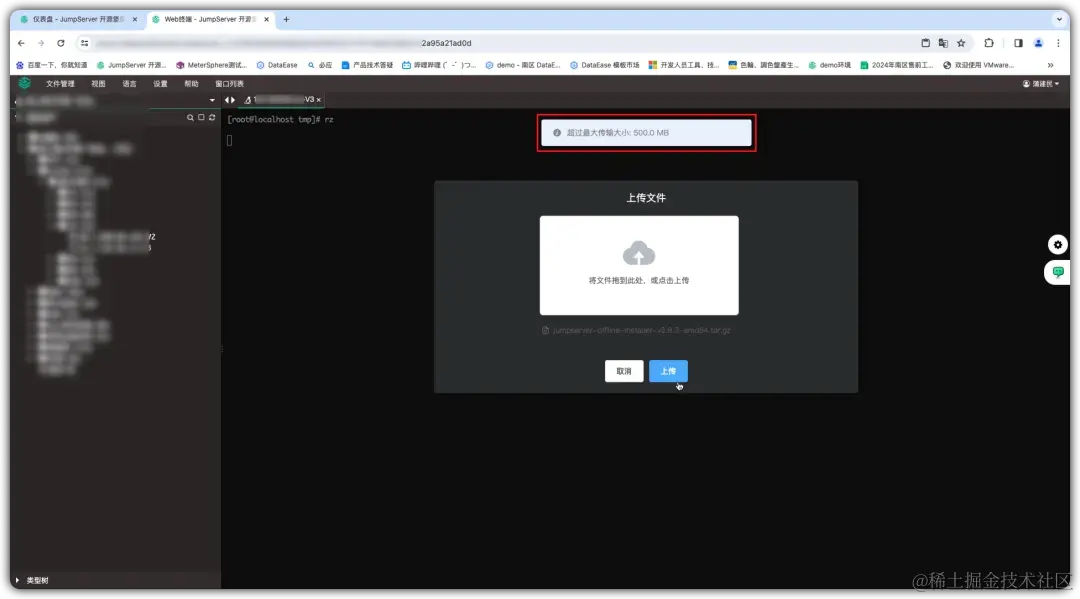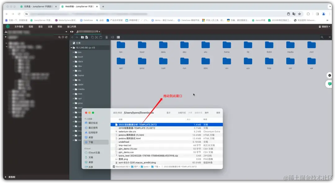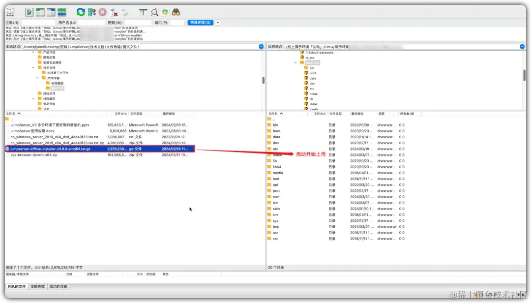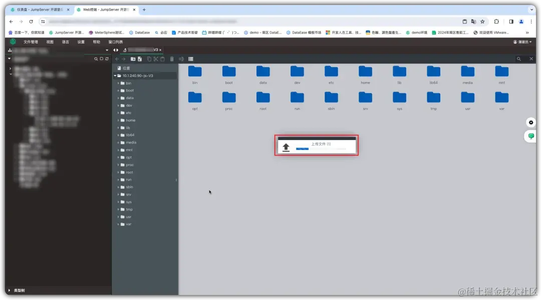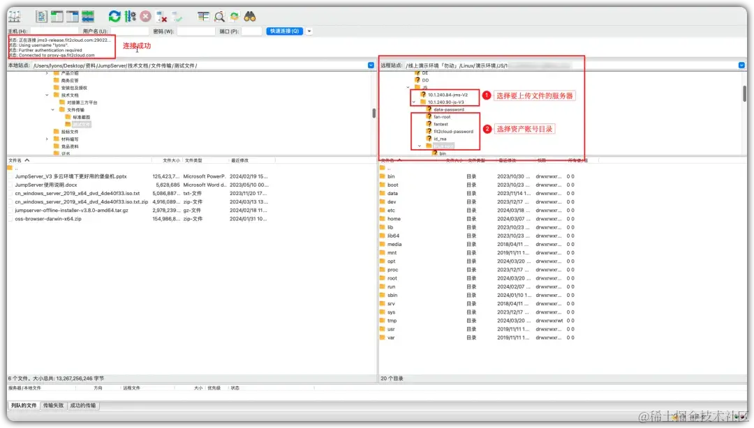 ② 连接成功后,选择需要上传文件的服务器和资产账号目录,拖动文件直接上传,系统会弹窗要求用户再次输入JumpServer登录密码和MFA验证码,确认后即可开始文件传输;