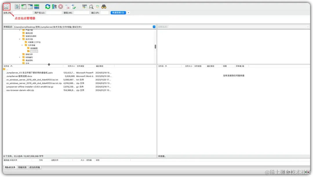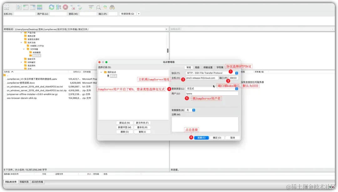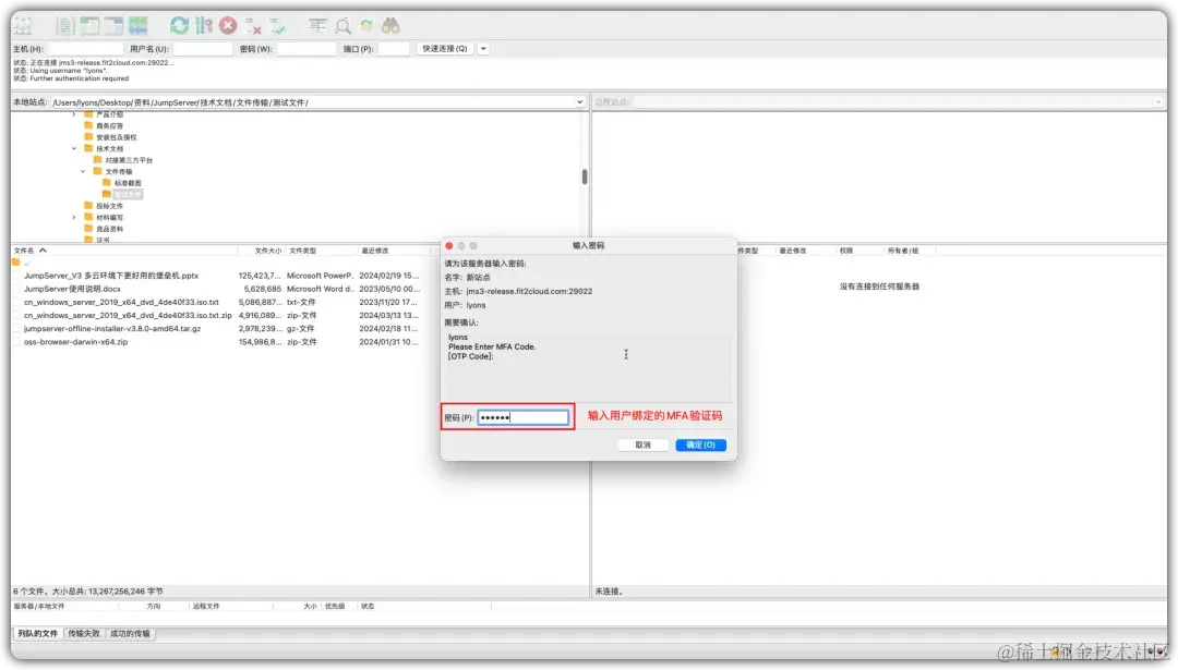 ① 点击FileZilla工具的“站点管理器”,填写相关信息,点击“连接”按钮,输入JumpServer的登录密码和MFA验证码,连接JumpServer堡垒机;