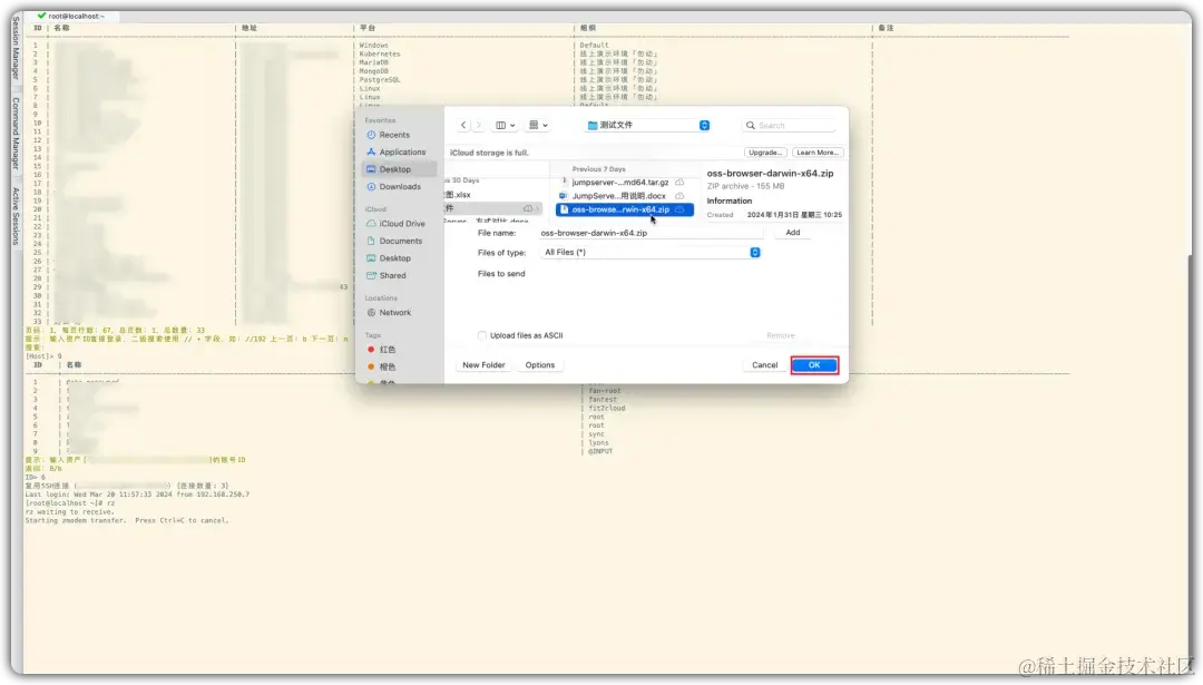 用户连接资产后,使用rz和sz命令,直接拖动文件进行文件上传/下载(秒表计时)。