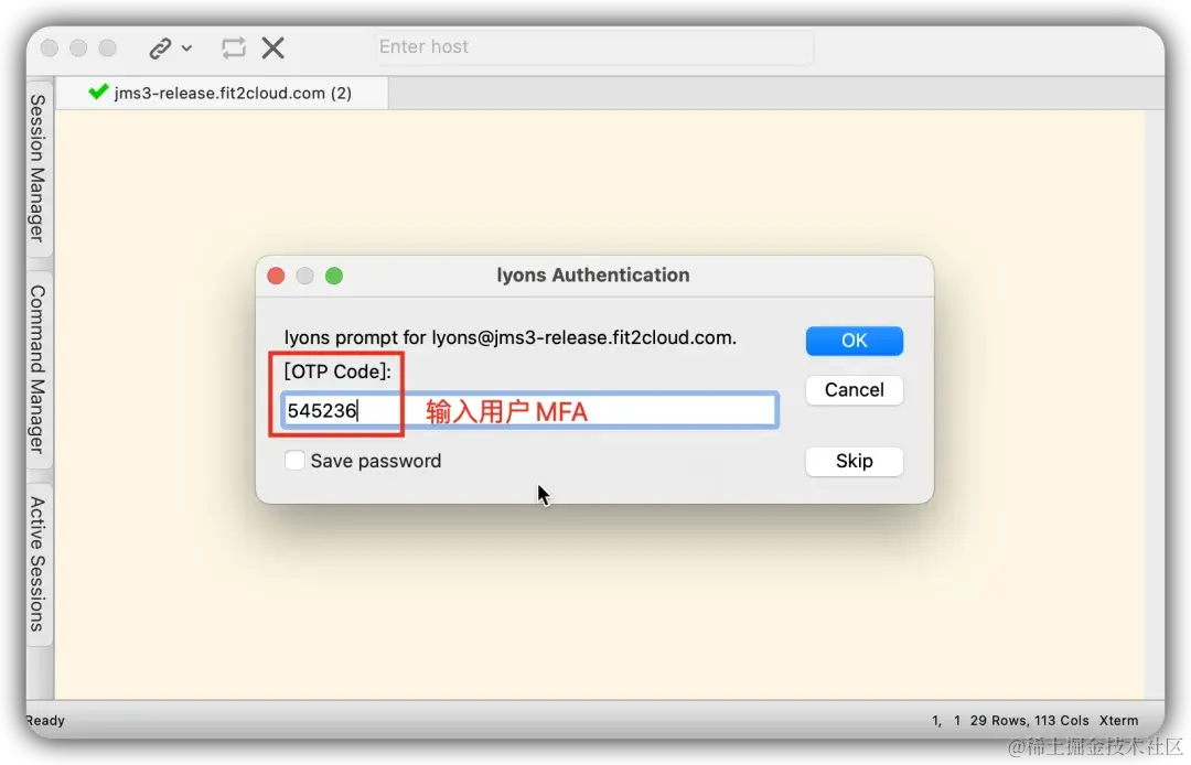 ① 在SecureCRT工具中输入JumpServer的用户登录密码及MFA验证码,登录至JumpServer堡垒机;