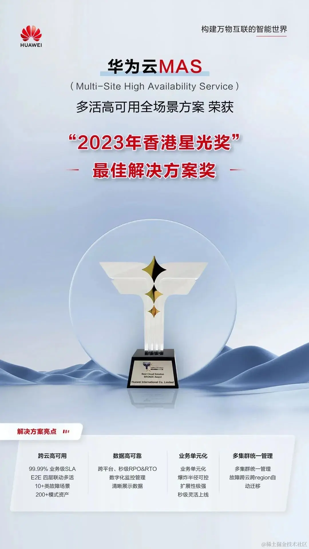 近期 ,华为云多活高可用服务MAS(Multi-Site High Availability Service,简称MAS)荣获“2023年香港星光奖”「最佳解决方案奖 」,凭借多集群统一管理的业务容灾能力获得香港通讯业的肯定。