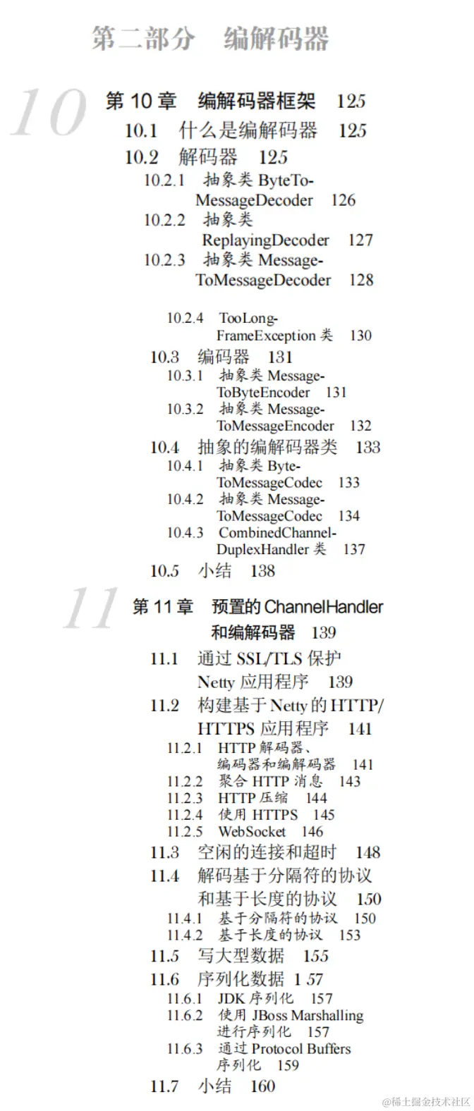 第 10 章介绍了编码器和解码器。通过学习一些典型的用例,你将学习到 Netty 的基本的编解码器类。当学习这些类是如何融入整体框架的时候,你将会发现构建它们的 API和你学过的那些 API 一样,所以你马上就能使用它们。
