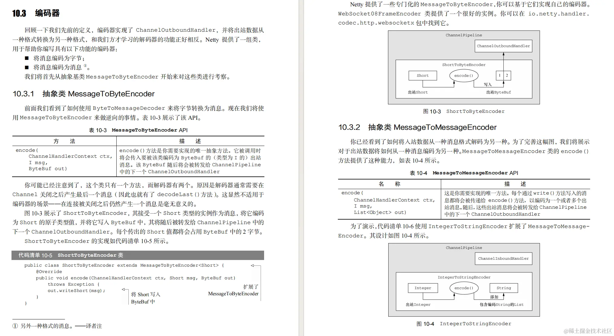 第 10 章介绍了编码器和解码器。通过学习一些典型的用例,你将学习到 Netty 的基本的编解码器类。当学习这些类是如何融入整体框架的时候,你将会发现构建它们的 API和你学过的那些 API 一样,所以你马上就能使用它们。