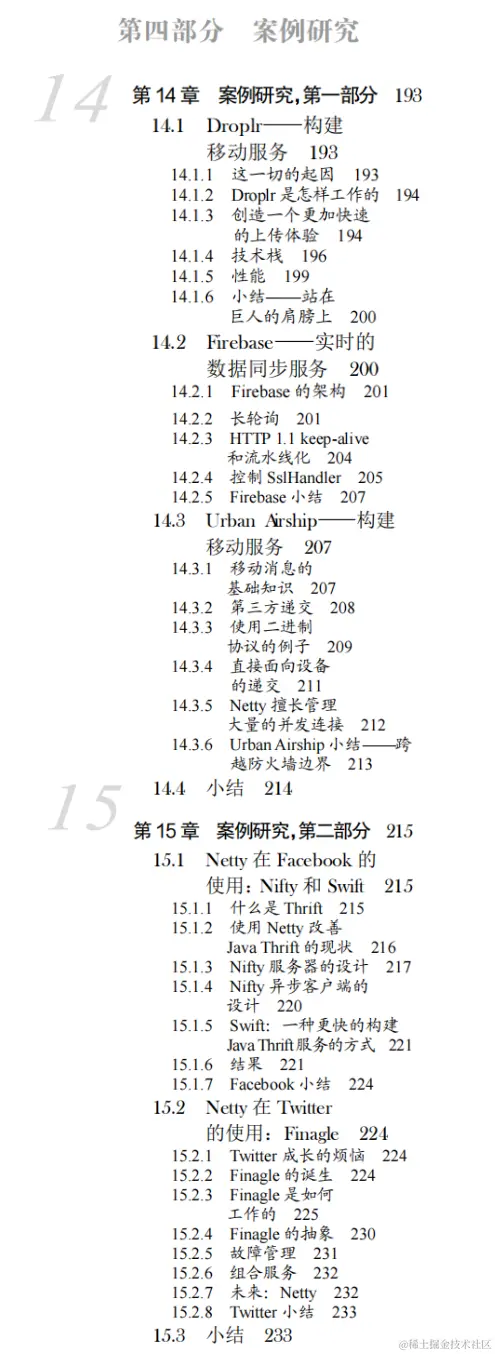 最后一部分介绍的是5家知名公司使用Netty 实现的任务关键型的系统的案例研究。第14章是关于Droplr、Firebase和 Urban Airship 的项目。第15章讨论了在 Facebook 和 Twitter 所完成的工作。
