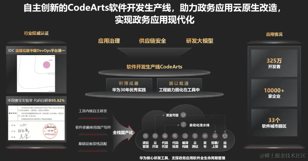 当前,国内软件优势主要集中在应用软件领域,核心基础软件领域与海外存在差距,为了保障国内软件产业研发连续性,推进基础软件自主创新发展成为重中之重。华为云CodeArts是一站式DevSecOps平台,致力于将软件开发所需的38款工具集成在这一个平台,围绕自主创新、规范化应用治理、全方位安全防护,让政务和企业客户放心云上应用研发、专注业务创新。