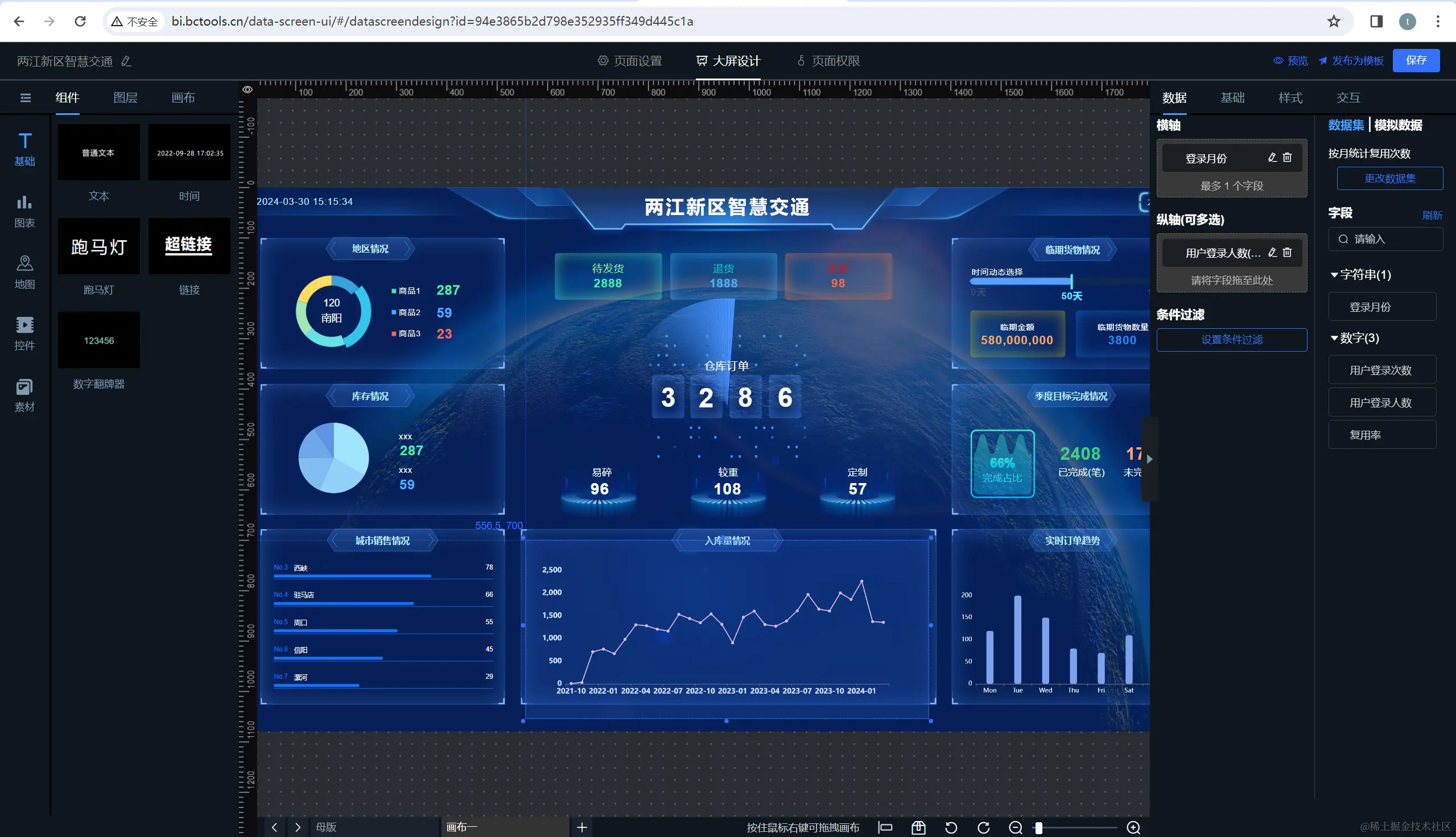 大屏配置,侧重样式、组件、素材等配置管理,支持多页面、多图层、统一模板等操作配置