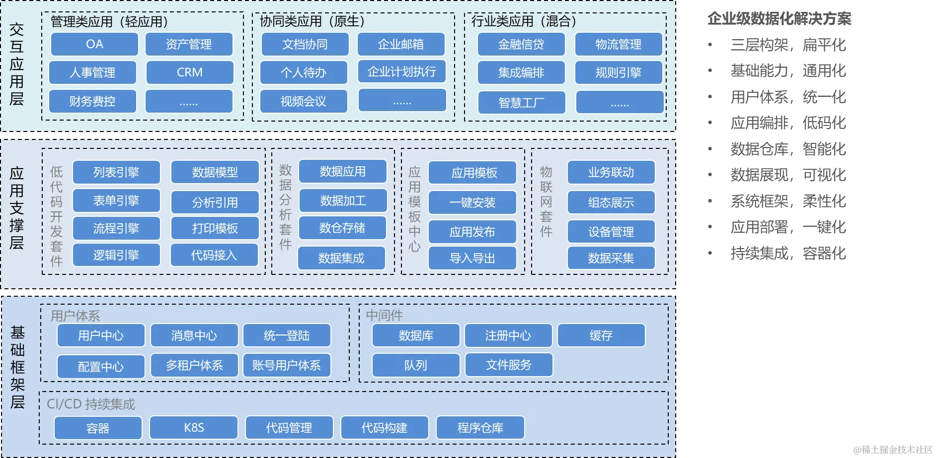 - 能力层: 应用配置(低代码)、数据分析配置(BI)、物联网(数采)、应用中心(应用持续化集成);