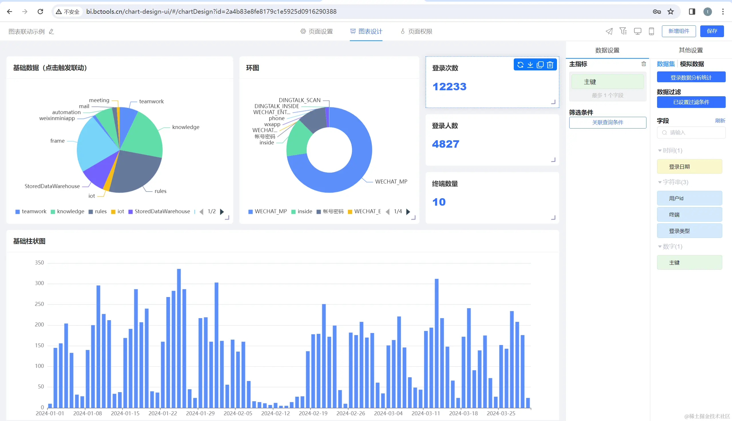 图表配置,自定义图表、关联数据集、设置响应样式与查询条件: