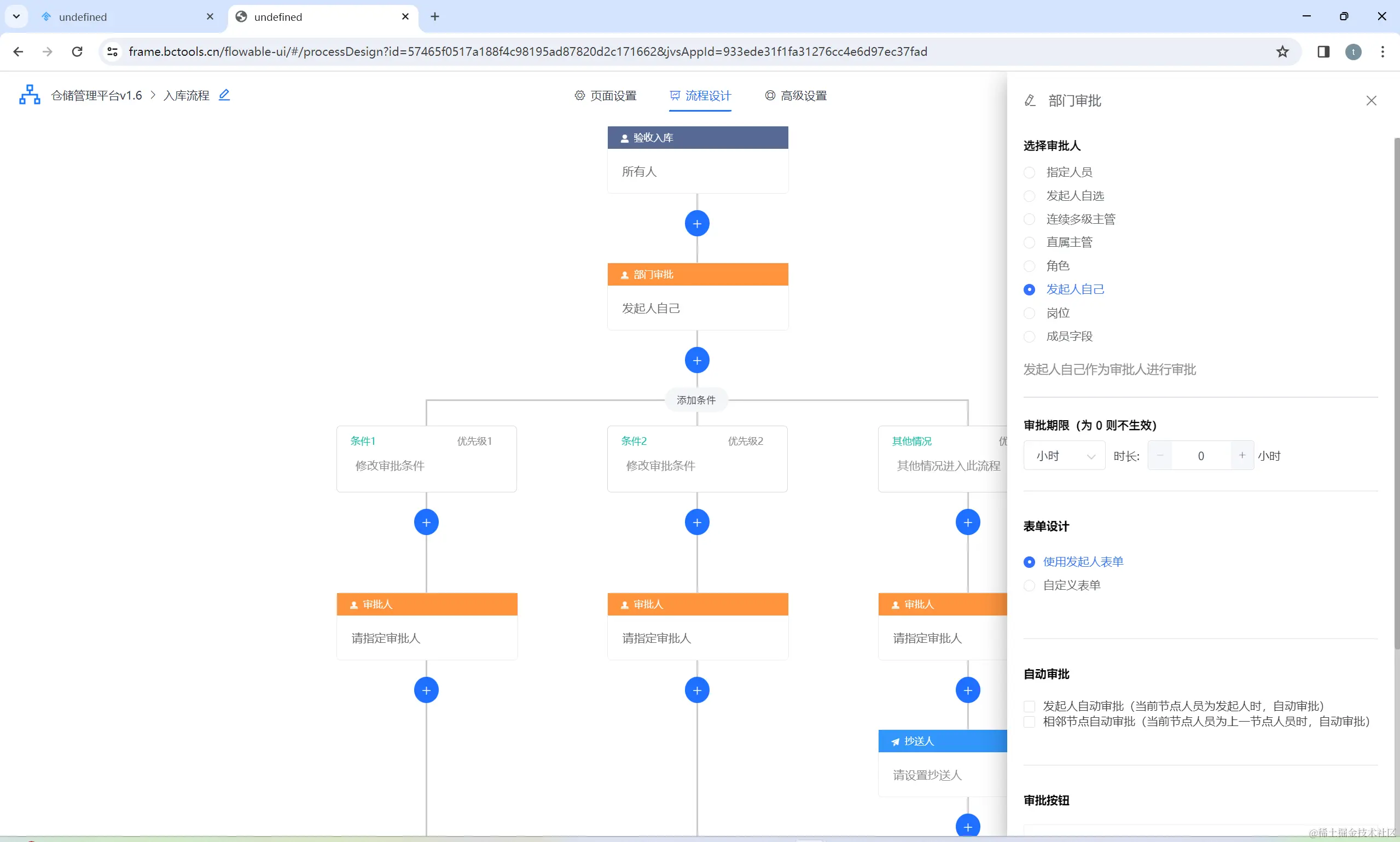 流程配置器:便捷的流程配置环节(开始、审批、抄送、分支、并行、逻辑)、人员配置、处理的表单页面、特殊动态的流程配置等等: