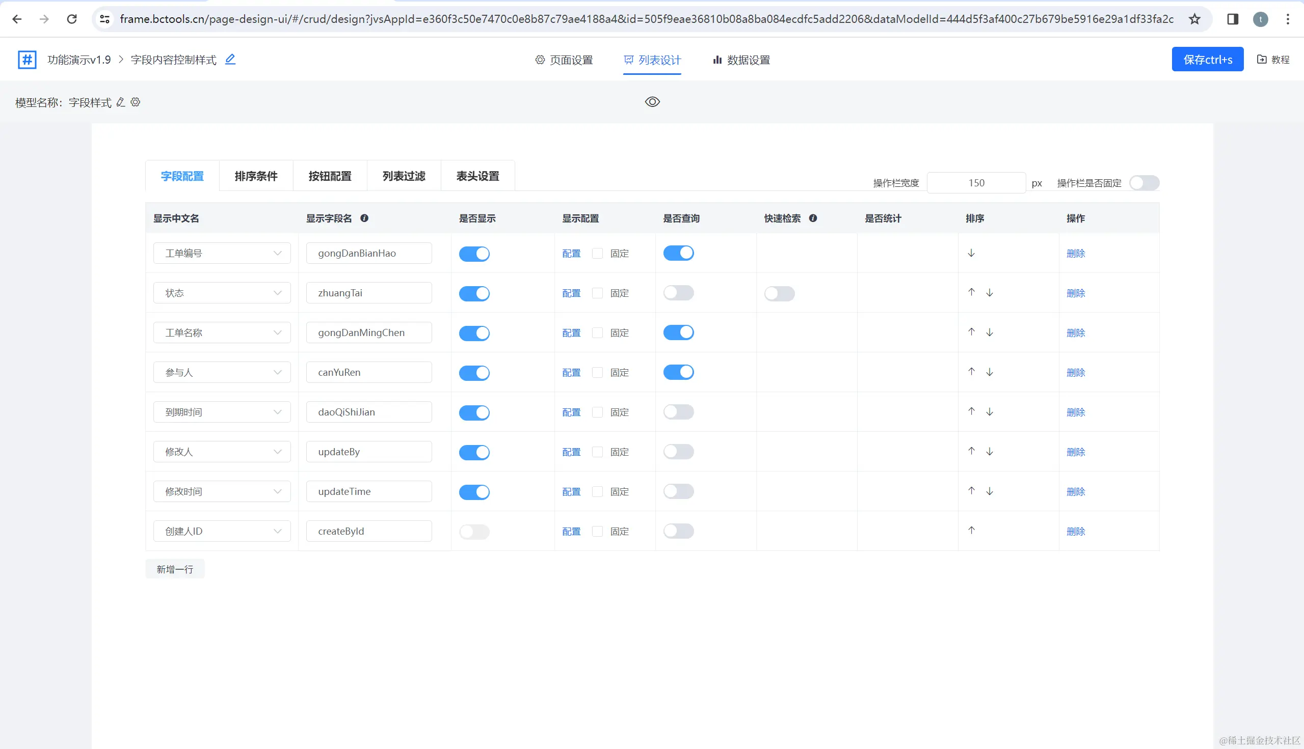 列表页配置器,支持数据展示配置(关联数据模型)、按钮配置、查询条件配置、过滤条件配置、表头设置等
